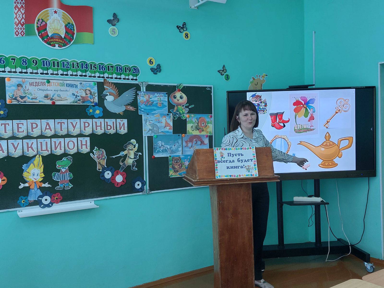 К Неделе детской книги в фойе школы библиотекарем Ионис Т.А. оформлен информационный стенд «Неделя детской книги», на котором размещен план проведения мероприятий на Неделе, интересные факты о книге и чтении, лучшие работы детей «Любимые герои со страниц детских книг».